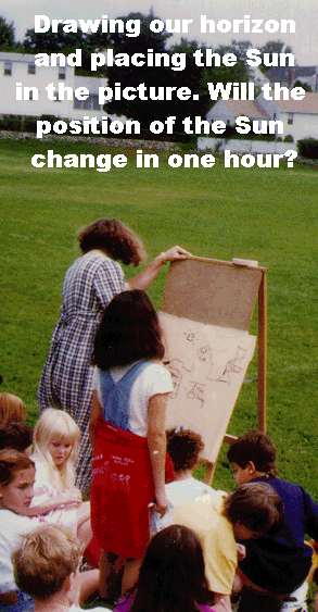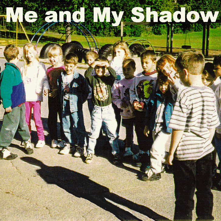 The lower grades focussed more on shadows. Here is a first grade class out side on a sunny day tracing the shadows of their classmates from an investigation called "Me and My Shadow". Their teacher, Mrs. Pooley, asked them question such as: What makes a shadow? How can you change the shape of a shadow? What kinds of things can have shadows? Are all shadows caused by the Sun?While these students were tracing shadows, they found that by the time they had traced around to the other side of the shadow, they noticed their first lines were no longer on the shadow edge. They wondered about how this could happen, and discussion soon lead them into thinking about how shadows could change direction. Since they knew that their classmate had not moved, that could only mean the Sun had. |